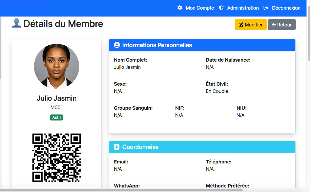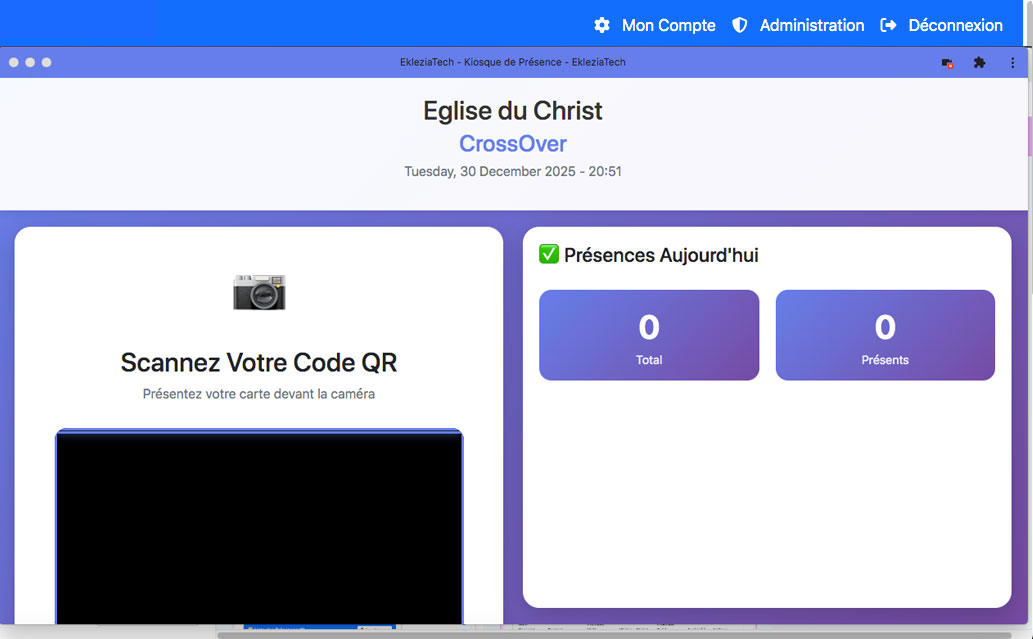 Chaque membre reçoit une carte personnalisée avec QR code unique, reliée à son profil dans le système EkleziaTech. En un simple scan, la présence est enregistrée lors des cultes, réunions, formations, événements spéciaux ou activités ministérielles — sans papier, sans listes manuelles, sans erreurs.